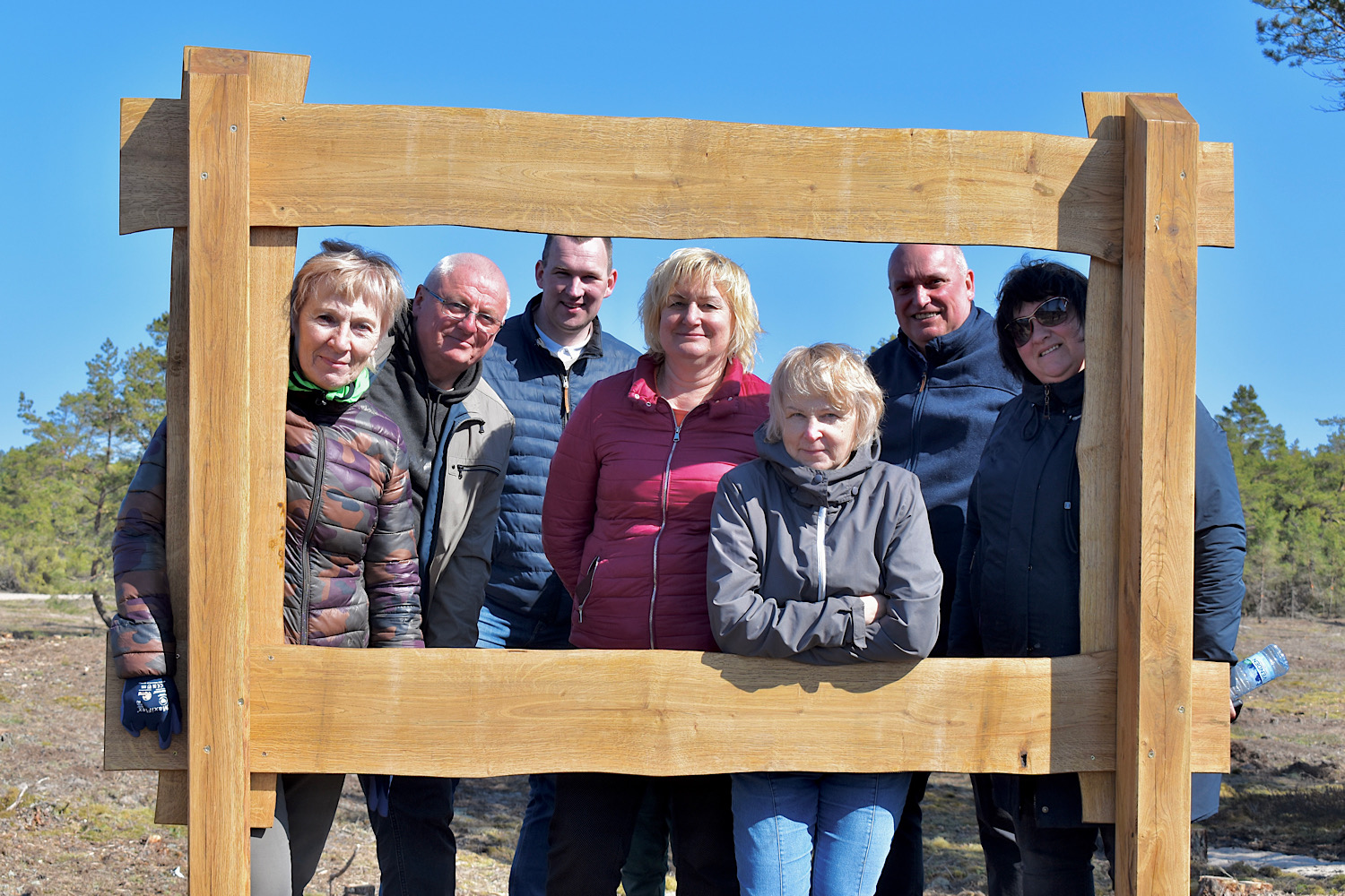 Pasākuma apmeklētāji fotografējas koka rāmī