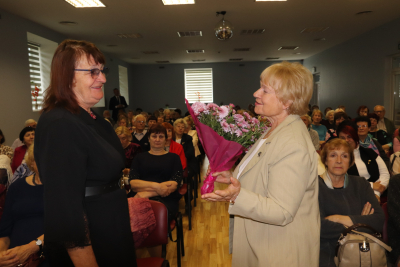 Pasākuma vadītāja uzrunā seniorus