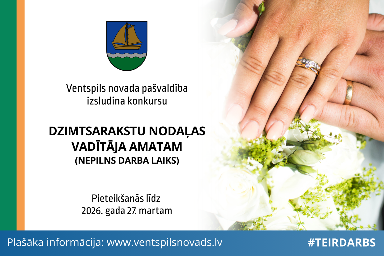 Ventspils novada pašvaldība (reģ. Nr. 90000052035) izsludina atklātu konkursu uz Ventspils novada Dzimtsarakstu nodaļas vadītāja amatu (nepilns darba laiks).