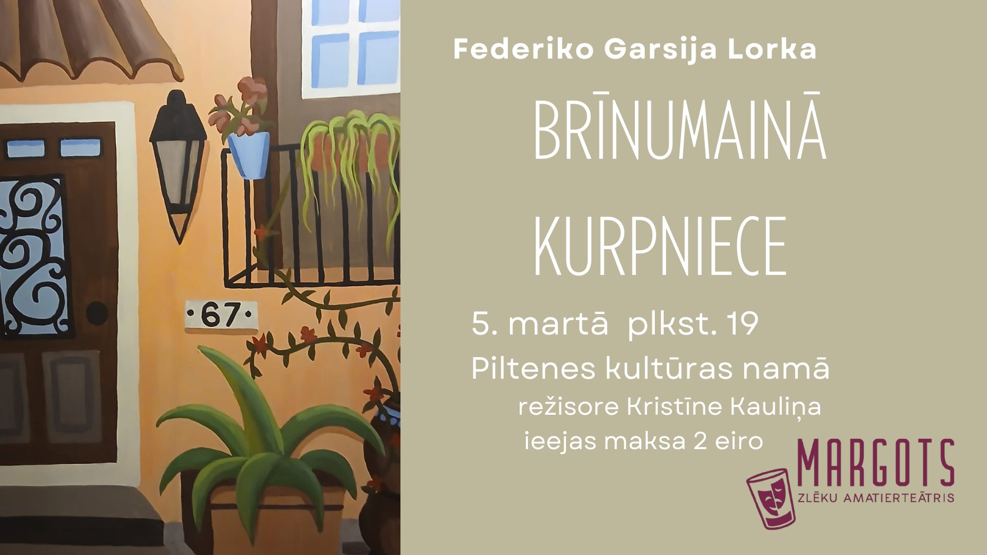 5. martā plkst. 19.00 Piltenes kultūras namā tiks rādīta teātra izrāde "Brīnumainā kurpniece", kuru spēlēs Zlēku amatierteātris "Margots". Uzveduma režisore – Kristīne Kauliņa.